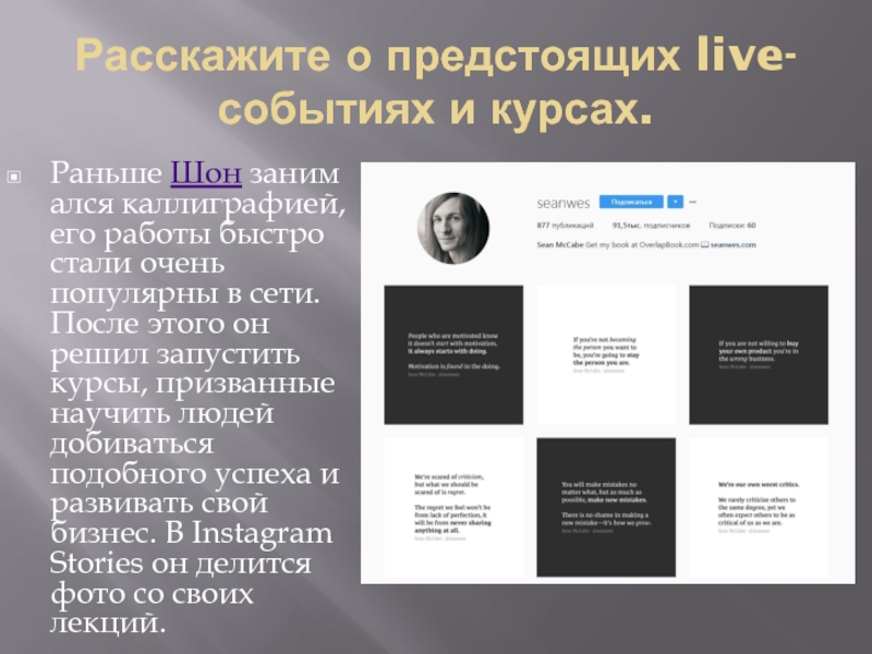 очень популярны в сети. После этого он решил запустить курсы, призванные научить людей добиваться подобного успеха и развивать свой бизнес. В Instagram Stories он делится фото со своих лекций.