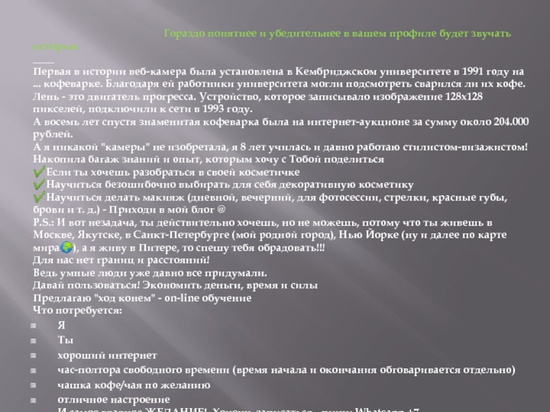 Гораздо понятнее и убедительнее в вашем профиле будет звучать история: