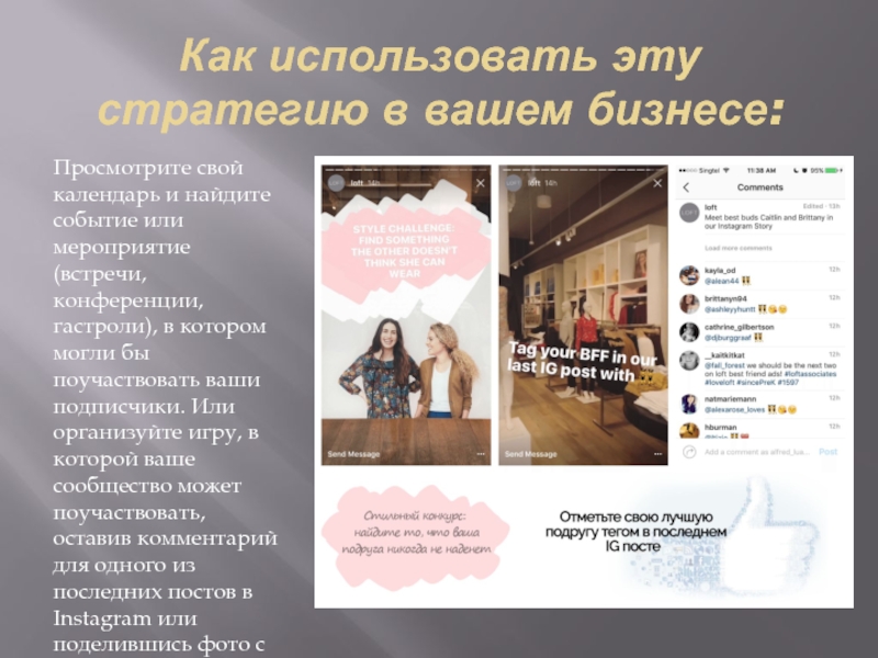 событие или мероприятие (встречи, конференции, гастроли), в котором могли бы поучаствовать ваши подписчики. Или организуйте игру, в которой ваше сообщество может поучаствовать, оставив комментарий для одного из последних постов в Instagram или поделившись фото с определенным хэштегом.