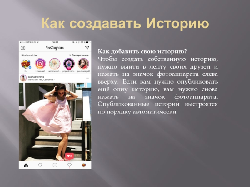 в ленту своих друзей и нажать на значок фотоаппарата слева вверху. Если вам нужно опубликовать ещё одну историю, вам нужно снова нажать на значок фотоаппарата. Опубликованные истории выстроятся по порядку автоматически.