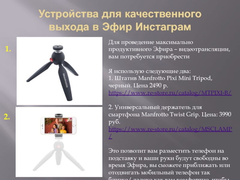 1. Штатив Manfrotto Pixi Mini Tripod, черный. Цена 2490 р. https://www.re-store.ru/catalog/MTPIXI-B/