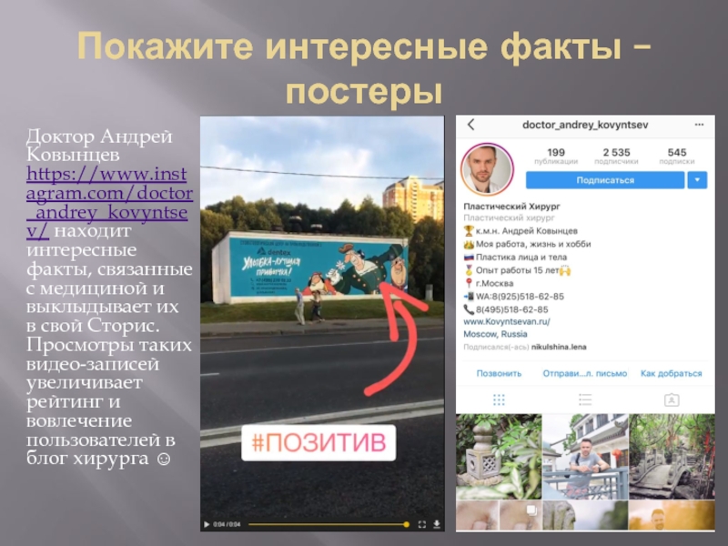 связанные с медициной и выклыдывает их в свой Сторис. Просмотры таких видео-записей увеличивает рейтинг и вовлечение пользователей в блог хирурга ☺