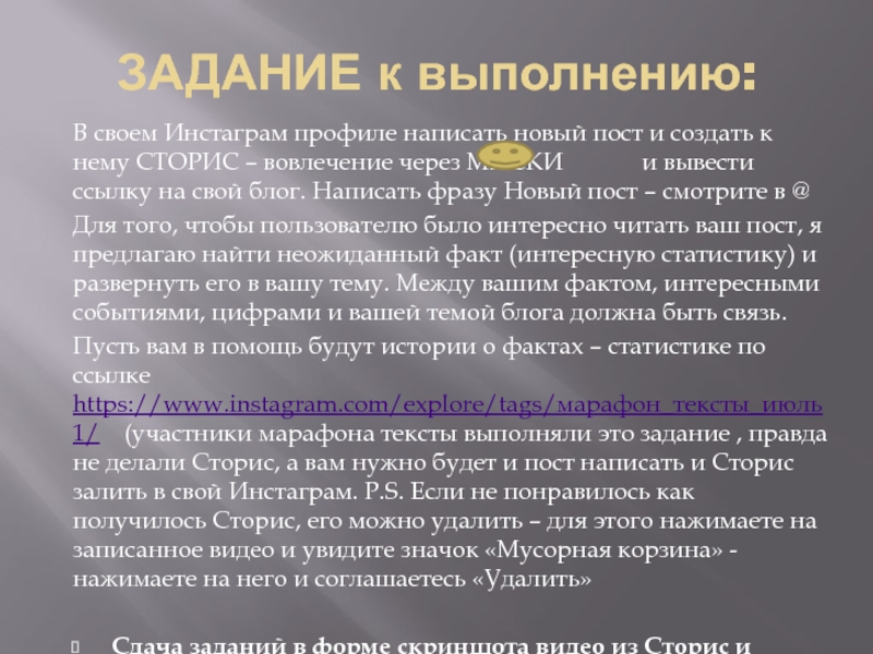 Пусть вам в помощь будут истории о фактах – статистике по ссылке https://www.instagram.com/explore/tags/марафон_тексты_июль1/ (участники марафона тексты выполняли это задание , правда не делали Сторис, а вам нужно будет и пост написать и Сторис залить в свой Инстаграм. P.S. Если не понравилось как получилось Сторис, его можно удалить – для этого нажимаете на записанное видео и увидите значок «Мусорная корзина» - нажимаете на него и соглашаетесь «Удалить»