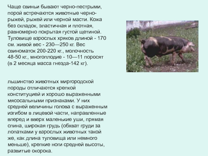 льшинство животных миргородской породы отличаются крепкой конституцией и хорошо выраженными мясосальными признаками. У них средней величины голова с выраженным изгибом в лицевой части, направленные вперед и вверх маленькие уши, прямая спина, широкая грудь (обхват груди за лопатками у взрослых животных такой же, как длина туловища или немного меньше), крепкие ноги средней высоты, развитые окорока.