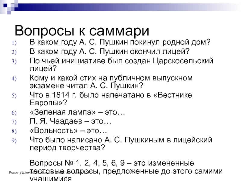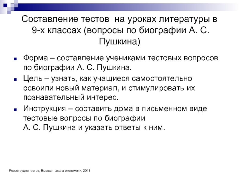 Форма – составление учениками тестовых вопросов по биографии А. С. Пушкина.