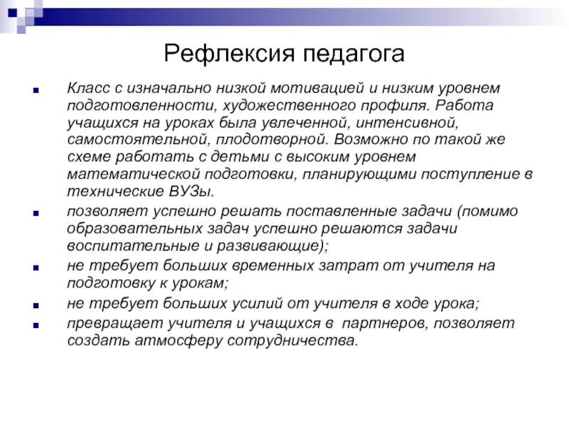 превращает учителя и учащихся в партнеров, позволяет создать атмосферу сотрудничества.