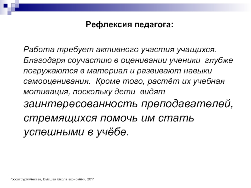 Работа требует активного участия учащихся. Благодаря соучастию в оценивании