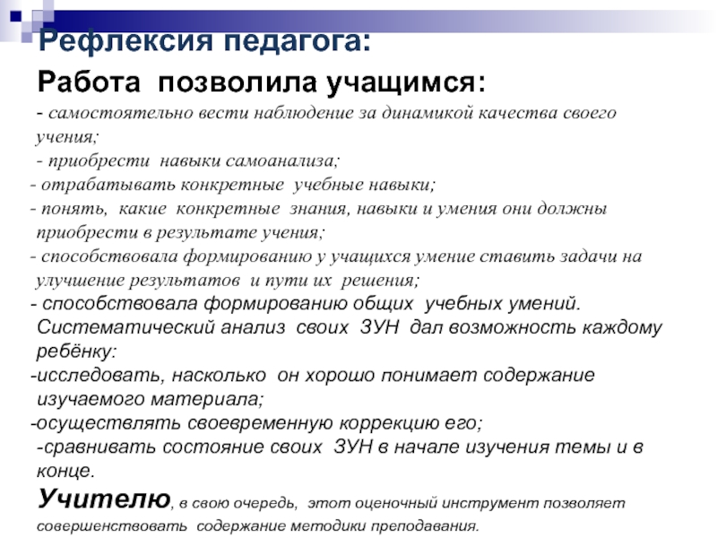 Учителю, в свою очередь, этот оценочный инструмент позволяет совершенствовать содержание методики преподавания.