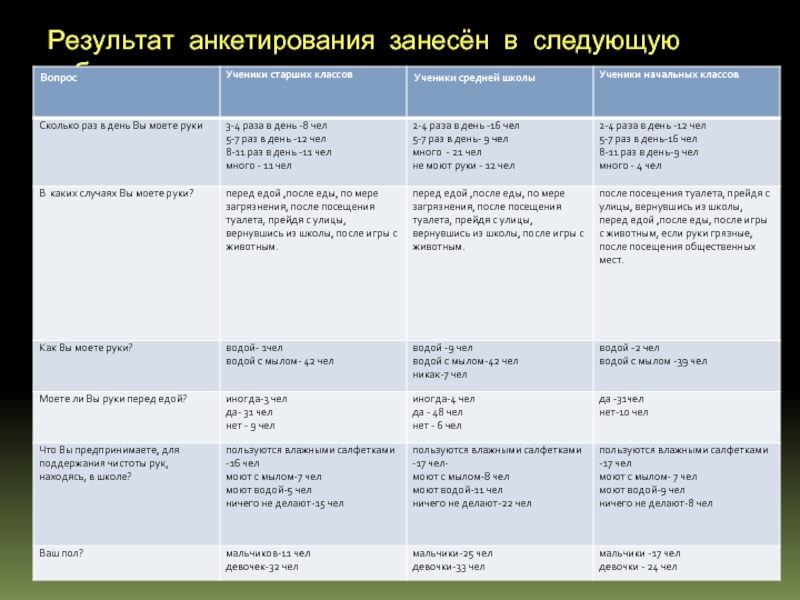 В начале своей работы я составила анкету для опроса учеников на тему «Гигиена рук»