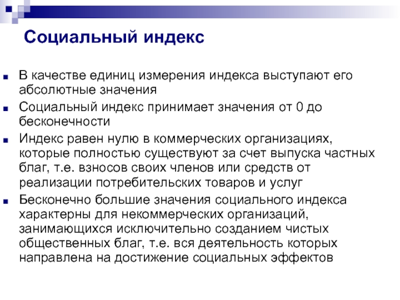 Бесконечно большие значения социального индекса характерны для некоммерческих организаций, занимающихся исключительно созданием чистых общественных благ, т.е. вся деятельность которых направлена на достижение социальных эффектов