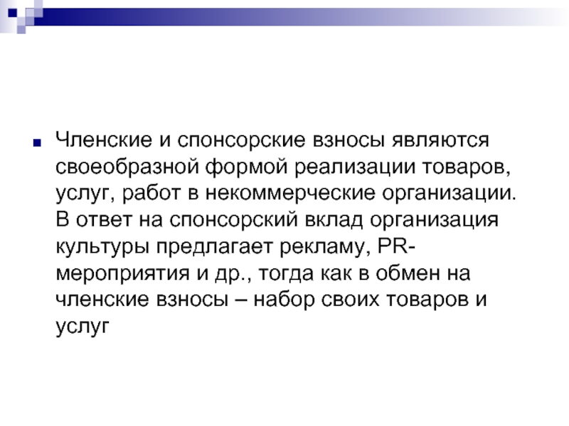 в некоммерческие организации. В ответ на спонсорский вклад организация культуры предлагает рекламу, PR- мероприятия и др., тогда как в обмен на членские взносы – набор своих товаров и услуг