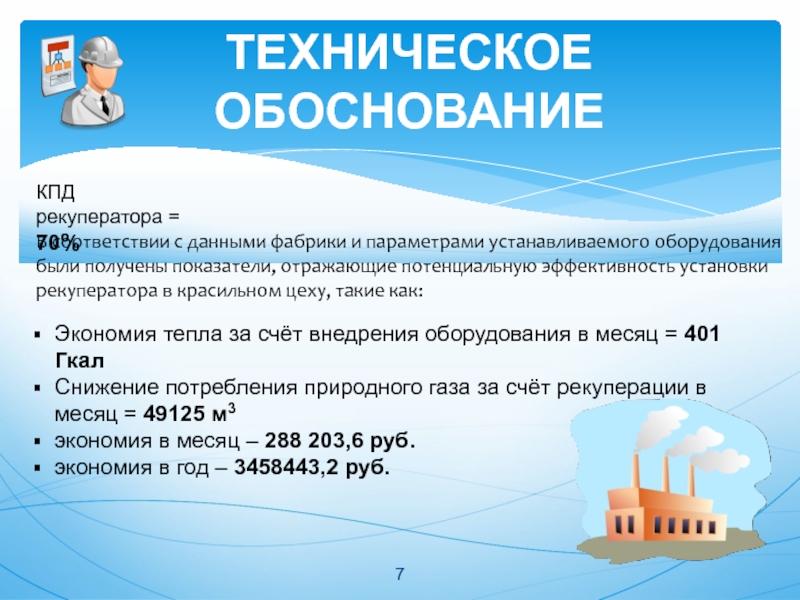 В соответствии с данными фабрики и параметрами устанавливаемого оборудования были получены показатели, отражающие потенциальную эффективность установки рекуператора в красильном цеху, такие как: