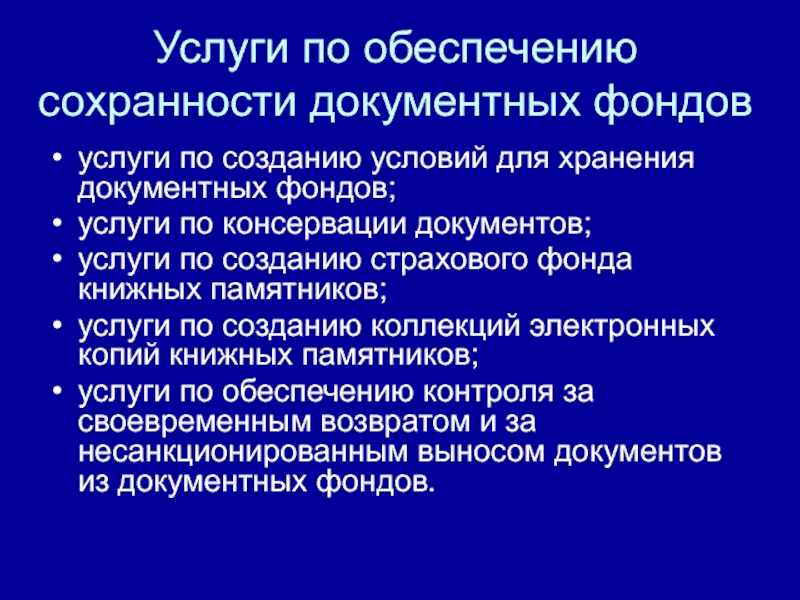 Слайд 8Услуги по обеспечению сохранности документных фондов