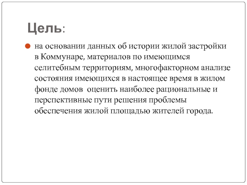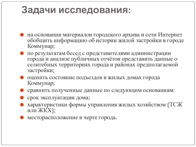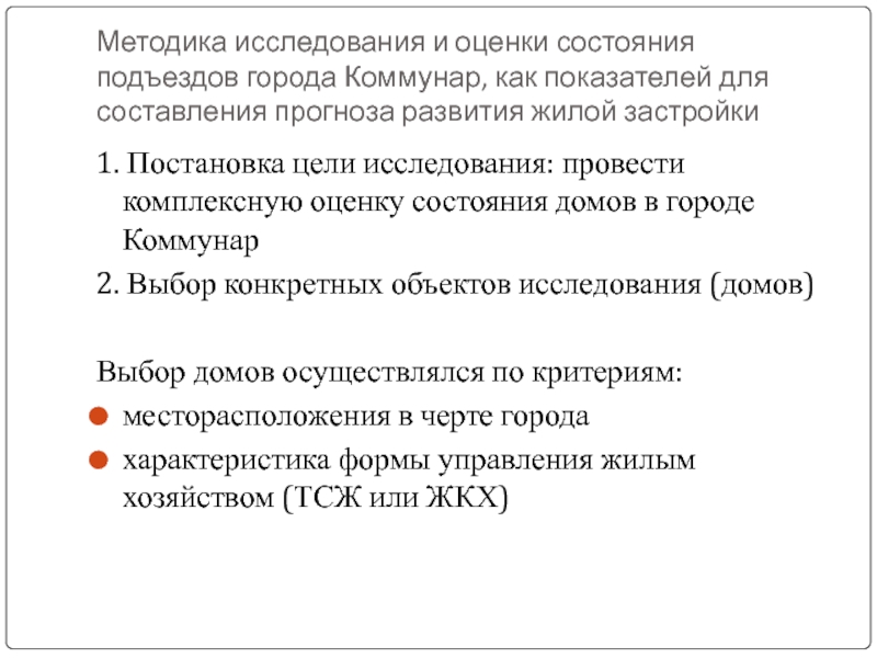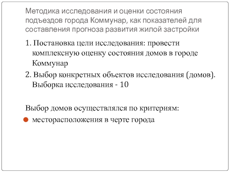 1. Постановка цели исследования: провести комплексную оценку состояния домов в городе Коммунар