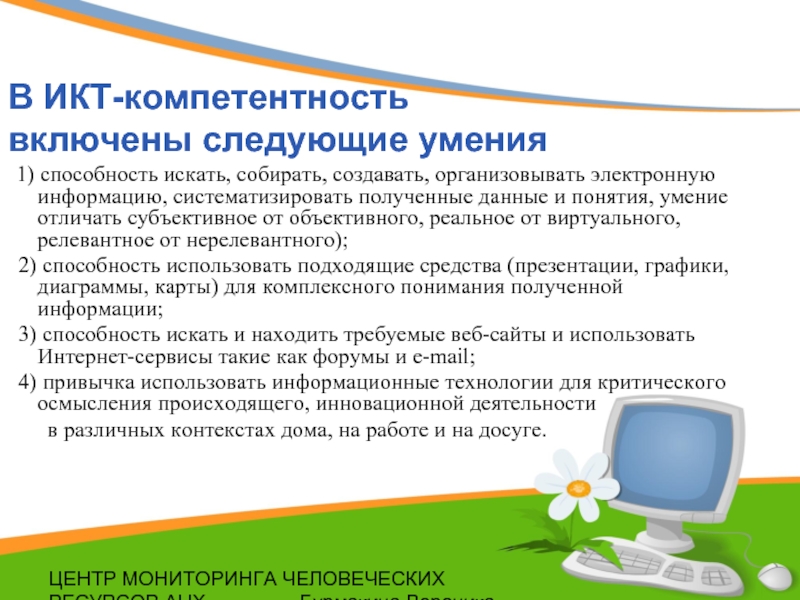 1) способность искать, собирать, создавать, организовывать электронную информацию, систематизировать полученные данные и понятия, умение отличать субъективное от объективного, реальное от виртуального, релевантное от нерелевантного);