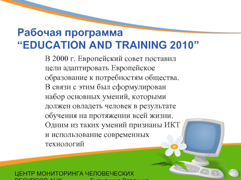 В 2000 г. Европейский совет поставил цели адаптировать Европейское образование к потребностям общества. В связи с этим был сформулирован набор основных умений, которыми должен овладеть человек в результате обучения на протяжении всей жизни. Одним из таких умений признаны ИКТ и использование современных технологий