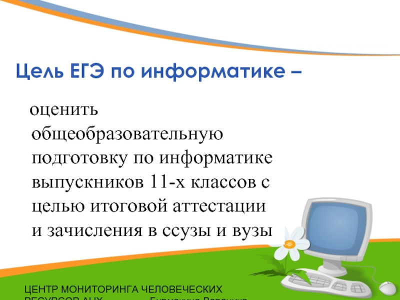 оценить общеобразовательную подготовку по информатике выпускников 11-х классов с целью итоговой аттестации и зачисления в ссузы и вузы