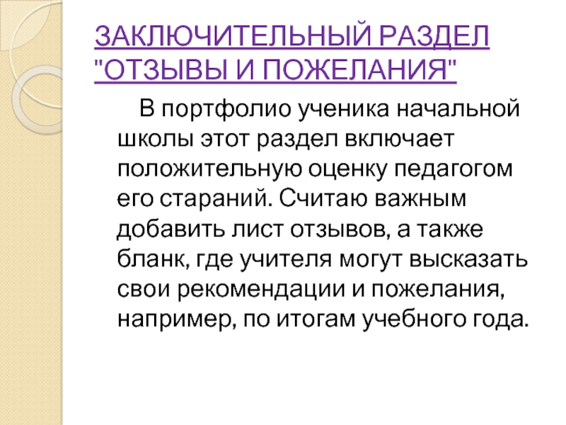 начальной школы этот раздел включает положительную оценку педагогом его стараний. Считаю важным добавить лист отзывов, а также бланк, где учителя могут высказать свои рекомендации и пожелания, например, по итогам учебного года.