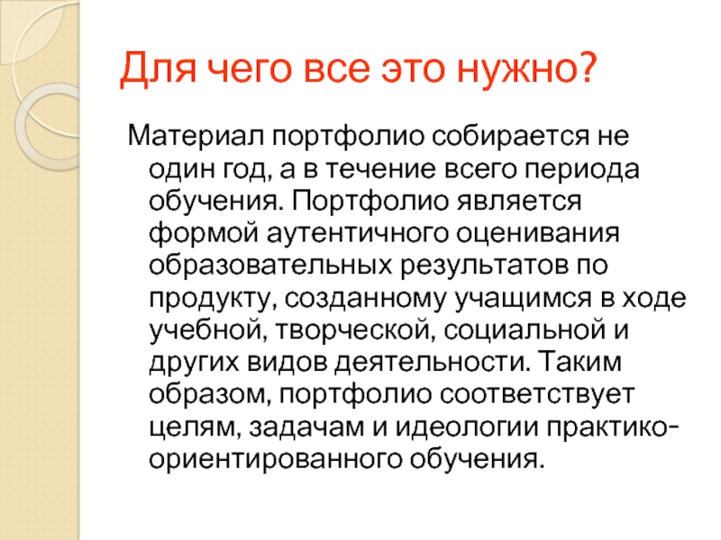 в течение всего периода обучения. Портфолио является формой аутентичного оценивания образовательных результатов по продукту, созданному учащимся в ходе учебной, творческой, социальной и других видов деятельности. Таким образом, портфолио соответствует целям, задачам и идеологии практико-ориентированного обучения.