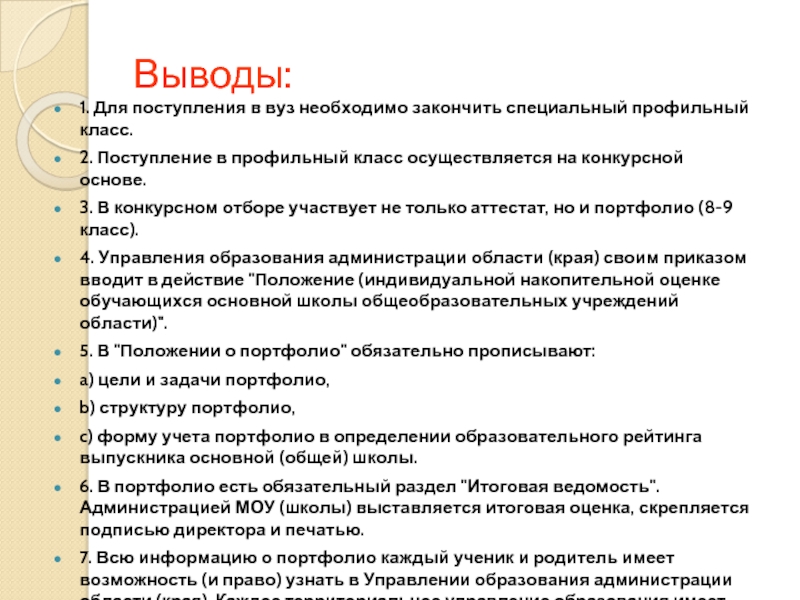 7. Всю информацию о портфолио каждый ученик и родитель имеет возможность (и право) узнать в Управлении образования администрации области (края). Каждое территориальное управление образования имеет свой официальный сайт.