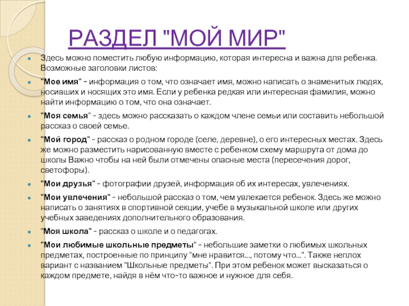 "Мое имя" - информация о том, что означает имя, можно написать о знаменитых людях, носивших и носящих это имя. Если у ребенка редкая или интересная фамилия, можно найти информацию о том, что она означает.