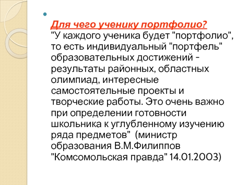 "портфель" образовательных достижений - результаты районных, областных олимпиад, интересные самостоятельные проекты и творческие работы. Это очень важно при определении готовности школьника к углубленному изучению ряда предметов" (министр образования В.М.Филиппов "Комсомольская правда" 14.01.2003)