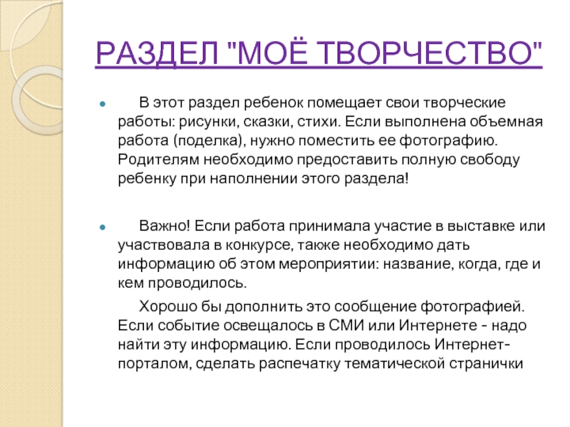 творческие работы: рисунки, сказки, стихи. Если выполнена объемная работа (поделка), нужно поместить ее фотографию. Родителям необходимо предоставить полную свободу ребенку при наполнении этого раздела!