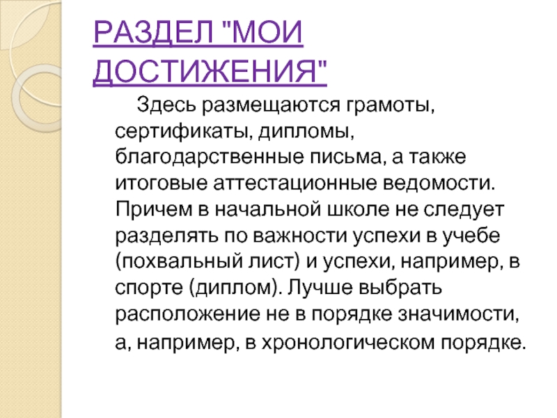 дипломы, благодарственные письма, а также итоговые аттестационные ведомости. Причем в начальной школе не следует разделять по важности успехи в учебе (похвальный лист) и успехи, например, в спорте (диплом). Лучше выбрать расположение не в порядке значимости, а, например, в хронологическом порядке.