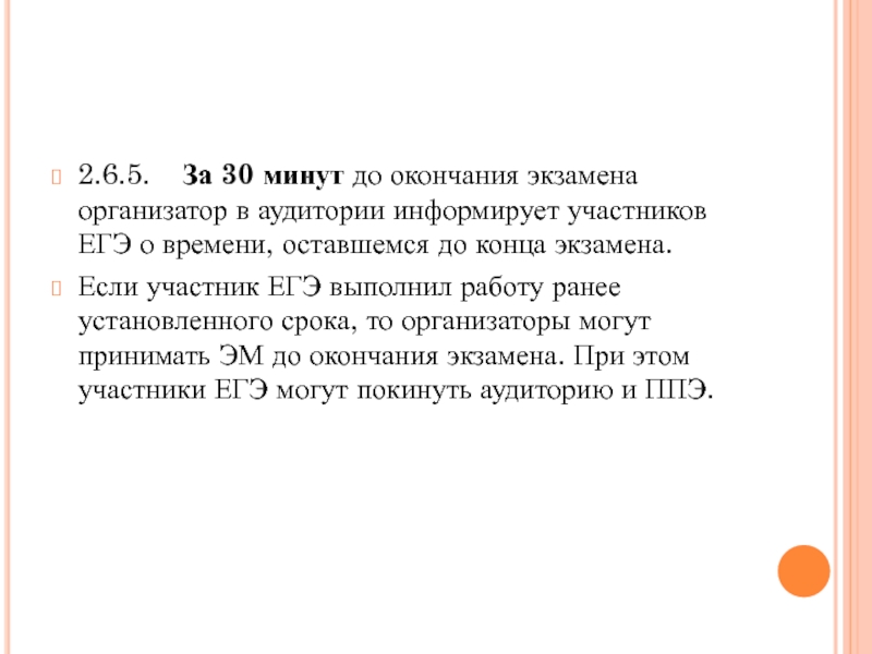 2.6.5. За 30 минут до окончания экзамена организатор в аудитории информирует участников