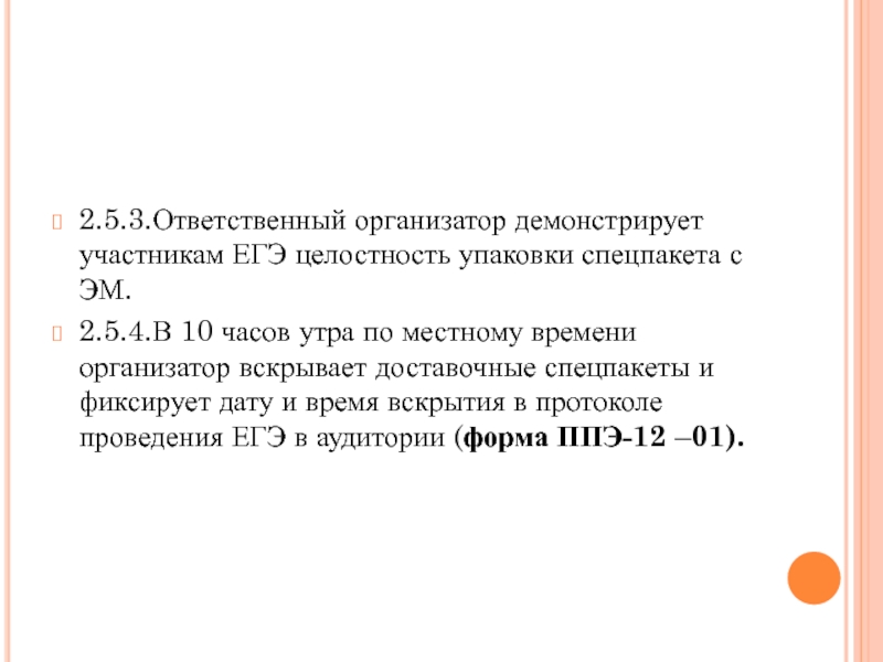 часов утра по местному времени организатор вскрывает доставочные спецпакеты и фиксирует дату и время вскрытия в протоколе проведения ЕГЭ в аудитории (форма ППЭ-12 –01).