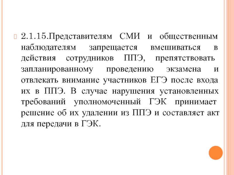 2.1.15.Представителям СМИ и общественным наблюдателям запрещается вмешиваться в действия сотрудников ППЭ,