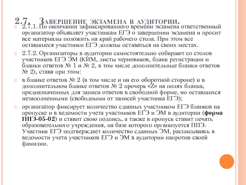 2.7.7. Организатор обеспечивает организованный выход участников ЕГЭ из аудитории.