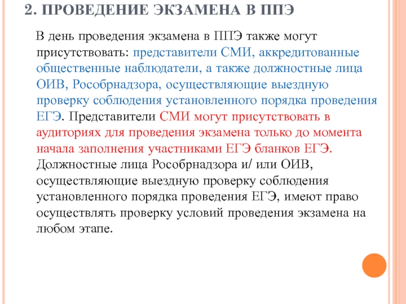 ППЭ также могут присутствовать: представители СМИ, аккредитованные общественные наблюдатели, а также должностные лица ОИВ, Рособрнадзора, осуществляющие выездную проверку соблюдения установленного порядка проведения ЕГЭ. Представители СМИ могут присутствовать в аудиториях для проведения экзамена только до момента начала заполнения участниками ЕГЭ бланков ЕГЭ. Должностные лица Рособрнадзора и/ или ОИВ, осуществляющие выездную проверку соблюдения установленного порядка проведения ЕГЭ, имеют право осуществлять проверку условий проведения экзамена на любом этапе.