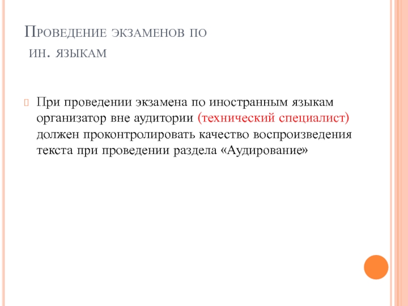 При проведении ЕГЭ по иностранным языкам аудитории, должны быть оборудованы средствами воспроизведения компакт-дисков. Организаторы должны настроить средство воспроизведения компакт-дисков так, чтобы звук записи было слышно всем участникам ЕГЭ в аудитории.