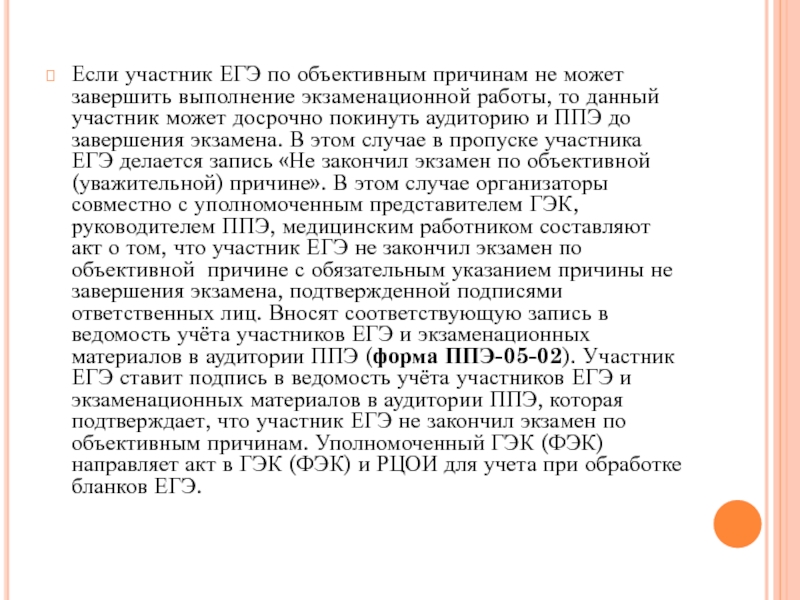 работы, то данный участник может досрочно покинуть аудиторию и ППЭ до завершения экзамена. В этом случае в пропуске участника ЕГЭ делается запись «Не закончил экзамен по объективной (уважительной) причине». В этом случае организаторы совместно с уполномоченным представителем ГЭК, руководителем ППЭ, медицинским работником составляют акт о том, что участник ЕГЭ не закончил экзамен по объективной причине с обязательным указанием причины не завершения экзамена, подтвержденной подписями ответственных лиц. Вносят соответствующую запись в ведомость учёта участников ЕГЭ и экзаменационных материалов в аудитории ППЭ (форма ППЭ-05-02). Участник ЕГЭ ставит подпись в ведомость учёта участников ЕГЭ и экзаменационных материалов в аудитории ППЭ, которая подтверждает, что участник ЕГЭ не закончил экзамен по объективным причинам. Уполномоченный ГЭК (ФЭК) направляет акт в ГЭК (ФЭК) и РЦОИ для учета при обработке бланков ЕГЭ.