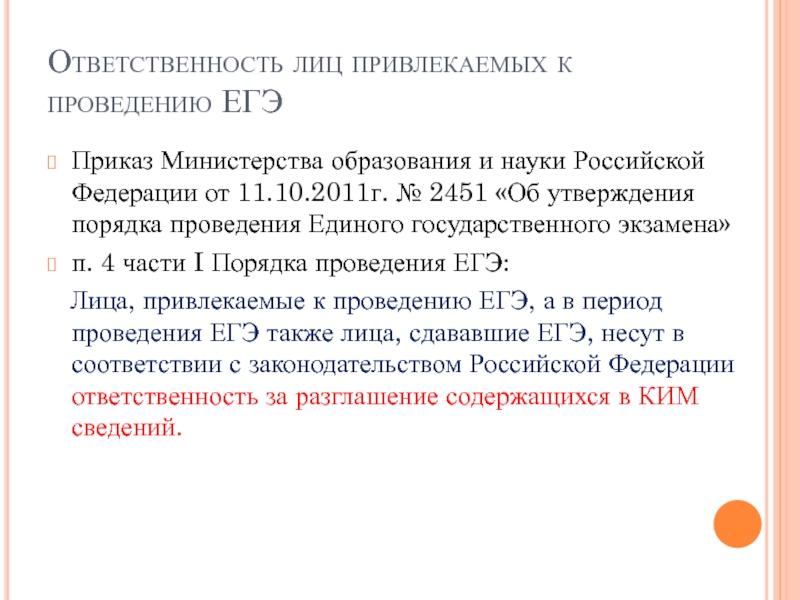 Слайд 2Ответственность лиц привлекаемых к проведению ЕГЭ