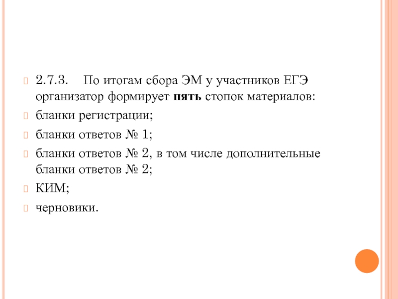 2.7.2. Организаторы в аудитории самостоятельно собирают со столов участников ЕГЭ ЭМ (КИМ, листы черновиков, бланк регистрации и бланки ответов № 1 и № 2, в том числе дополнительные бланки ответов № 2), ставя при этом: