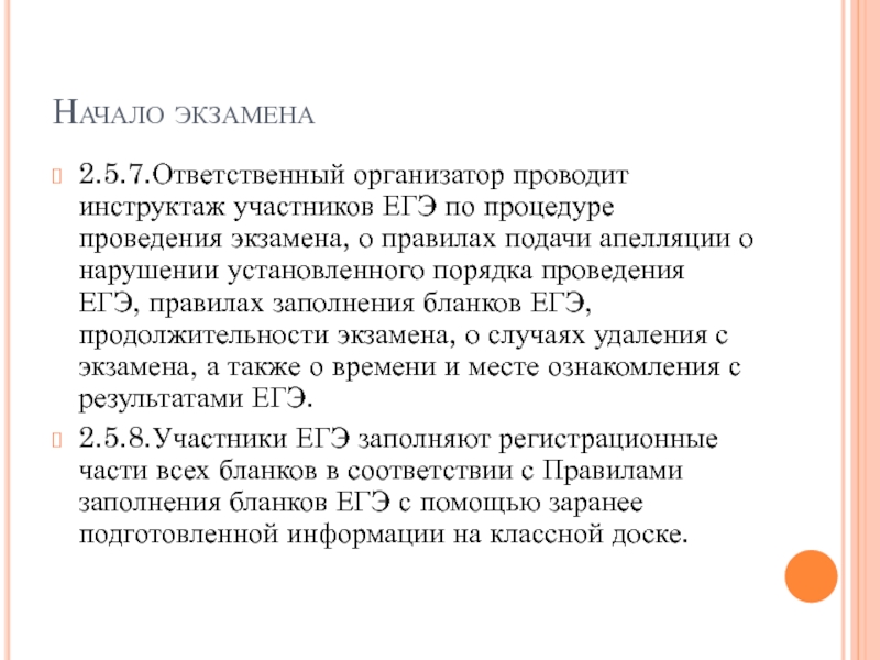 2.5.7.Ответственный организатор проводит инструктаж участников ЕГЭ по процедуре проведения экзамена,