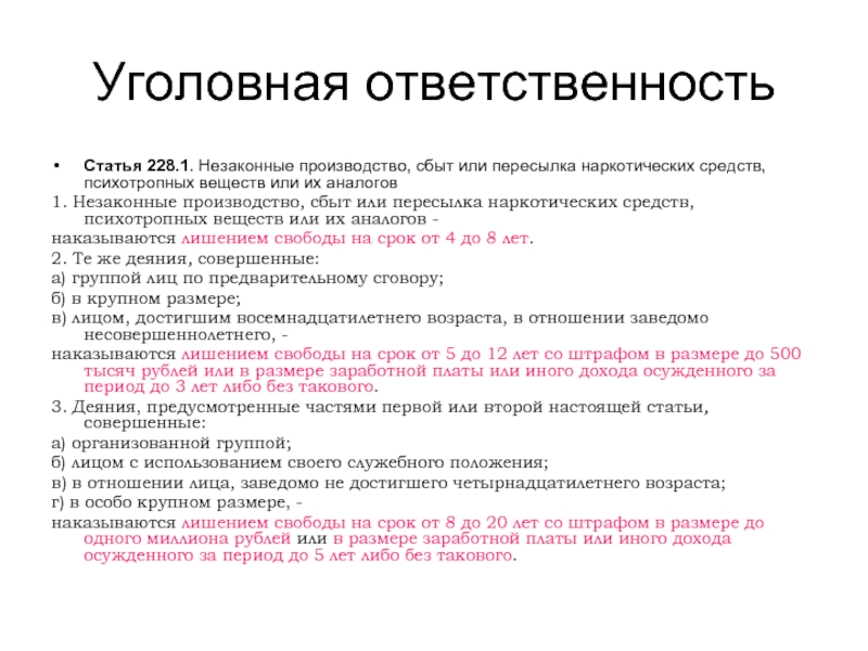 Статья 228.1. Незаконные производство, сбыт или пересылка наркотических средств, психотропных