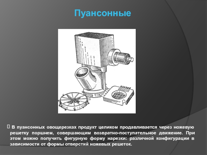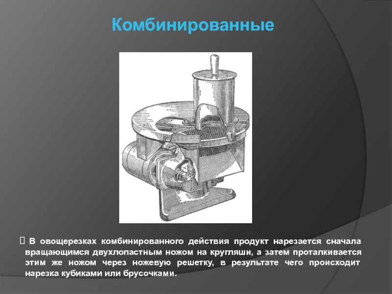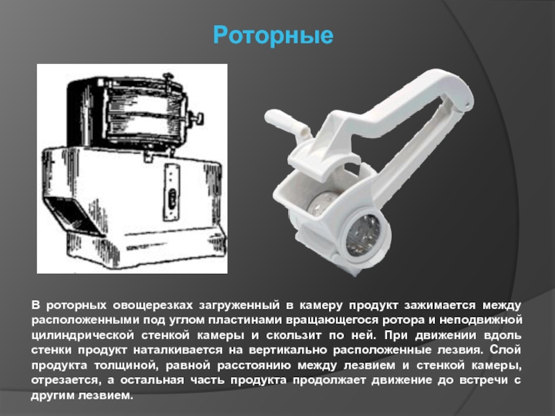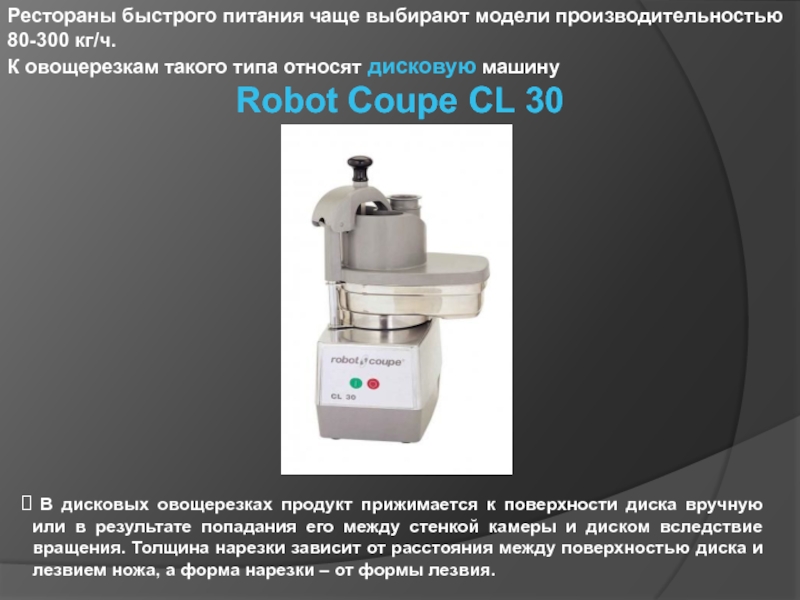 В дисковых овощерезках продукт прижимается к поверхности диска вручную или в результате попадания его между стенкой камеры и диском вследствие вращения. Толщина нарезки зависит от расстояния между поверхностью диска и лезвием ножа, а форма нарезки – от формы лезвия.