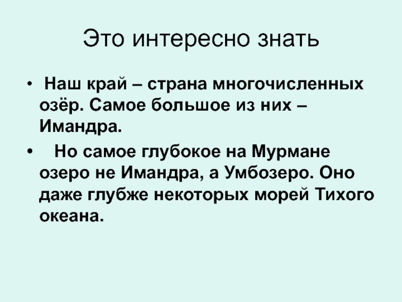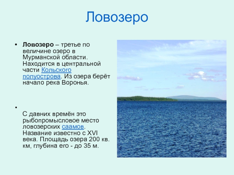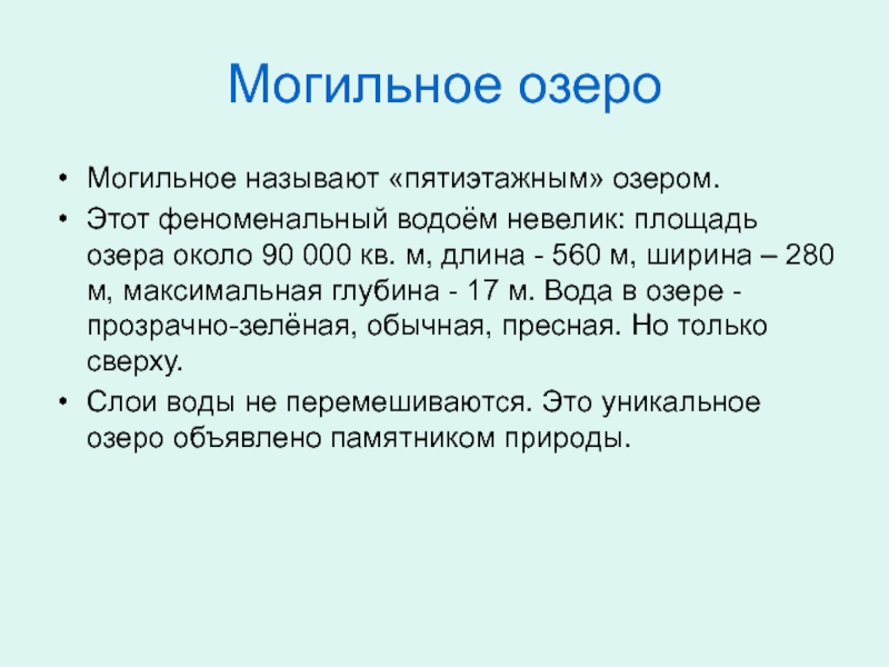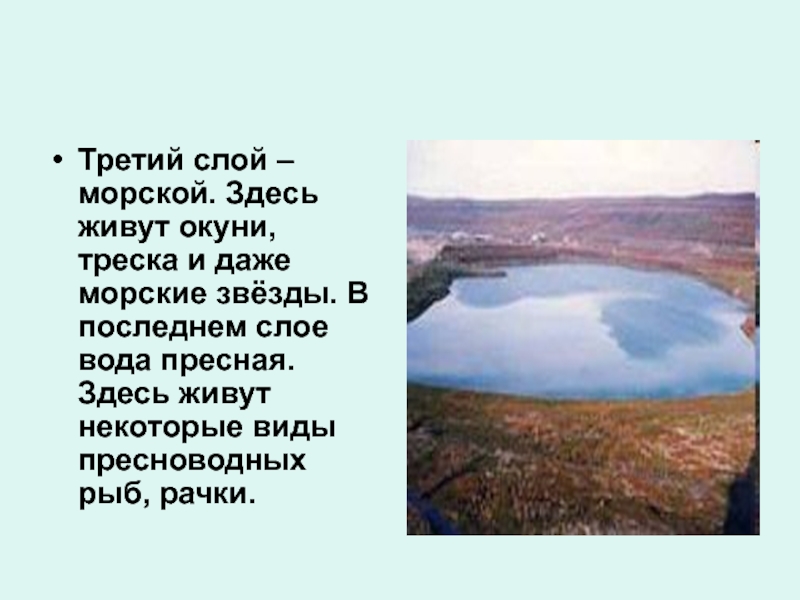 насчитывается более 110 тысяч озёр. Озеро – это природный водоём со стоячей водой. Во все озёра впадают реки и ручьи. Если из озера вытекает вода, оно называется проточным. Если вода из озера не вытекает, его называют бессточным.