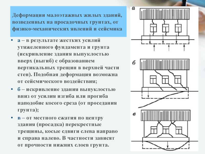а – в результате жестких усилий утяжеленного фундамента и грунта (искривление здания выпуклостью вверх (выгиб) с образованием вертикальных трещин в верхней части стен). Подобная деформация возможна от сейсмического воздействия;