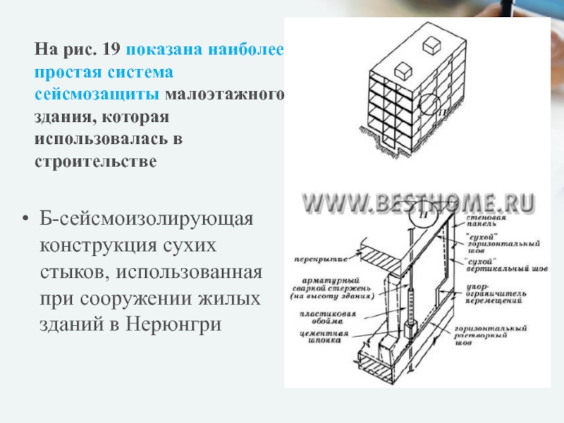 Слайд 13Б-сейсмоизолирующая конструкция сухих стыков, использованная при сооружении жилых зданий в Нерюнгри