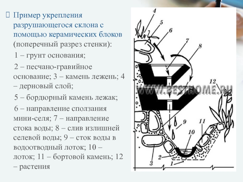 Слайд 44Пример укрепления разрушающегося склона с помощью керамических блоков (поперечный разрез стенки):