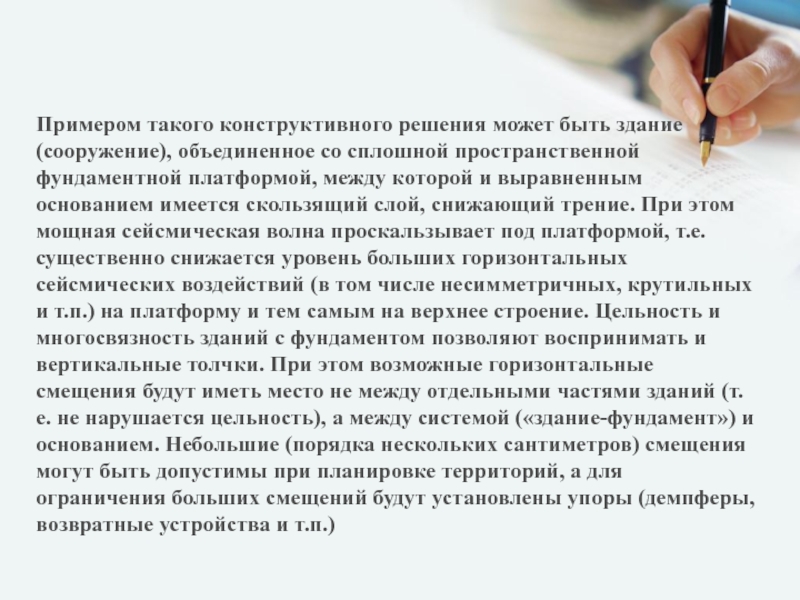 пространственной фундаментной платформой, между которой и выравненным основанием имеется скользящий слой, снижающий трение. При этом мощная сейсмическая волна проскальзывает под платформой, т.е. существенно снижается уровень больших горизонтальных сейсмических воздействий (в том числе несимметричных, крутильных и т.п.) на платформу и тем самым на верхнее строение. Цельность и многосвязность зданий с фундаментом позволяют воспринимать и вертикальные толчки. При этом возможные горизонтальные смещения будут иметь место не между отдельными частями зданий (т.е. не нарушается цельность), а между системой («здание-фундамент») и основанием. Небольшие (порядка нескольких сантиметров) смещения могут быть допустимы при планировке территорий, а для ограничения больших смещений будут установлены упоры (демпферы, возвратные устройства и т.п.)