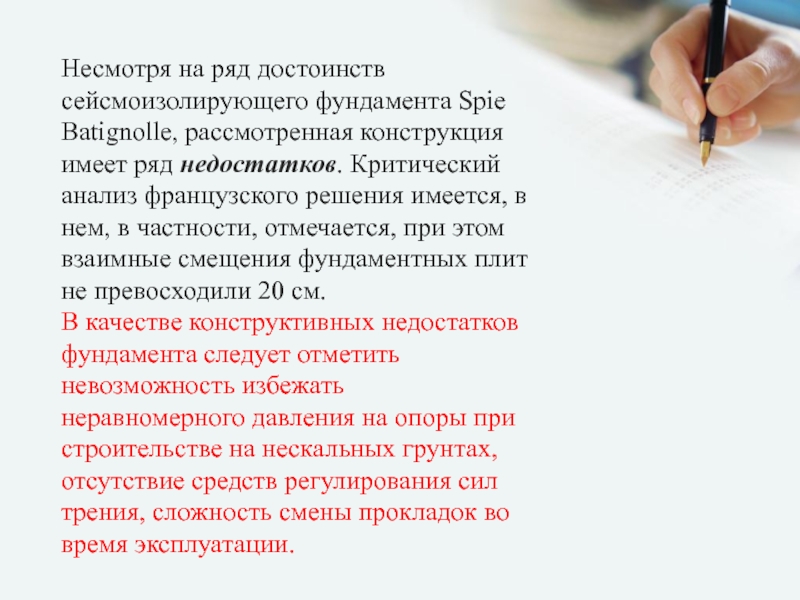 Несмотря на ряд достоинств сейсмоизолирующего фундамента Spie Batignolle, рассмотренная конструкция имеет