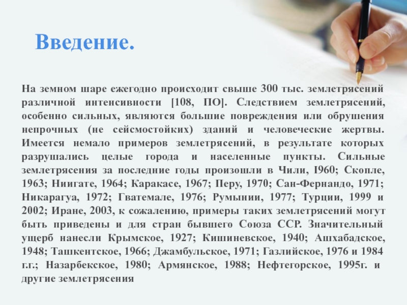[108, ПО]. Следствием землетрясений, особенно сильных, являются большие повреждения или обрушения непрочных (не сейсмостойких) зданий и человеческие жертвы. Имеется немало примеров землетрясений, в результате которых разрушались целые города и населенные пункты. Сильные землетрясения за последние годы произошли в Чили, I960; Скопле, 1963; Ниигате, 1964; Каракасе, 1967; Перу, 1970; Сан-Фернандо, 1971; Никарагуа, 1972; Гватемале, 1976; Румынии, 1977; Турции, 1999 и 2002; Иране, 2003, к сожалению, примеры таких землетрясений могут быть приведены и для стран бывшего Союза ССР. Значительный ущерб нанесли Крымское, 1927; Кишиневское, 1940; Ашхабадское, 1948; Ташкентское, 1966; Джамбульское, 1971; Газлийское, 1976 и 1984 г.г.; Назарбекское, 1980; Армянское, 1988; Нефтегорское, 1995г. и другие землетрясения