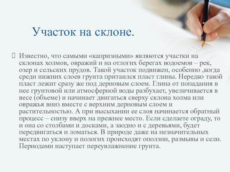 овражий и на отлогих берегах водоемов – рек, озер и сельских прудов. Такой участок подвижен, особенно ,когда среди нижних слоев грунта притаился пласт глины. Нередко такой пласт лежит сразу же под дерновым слоем. Глина от попадания в нее грунтовой или атмосферной воды разбухает, увеличивается в весе (объеме) и начинает двигаться сверху склона холма или овражья вниз вместе с верхним дерновым слоем и растительностью. А при высыхании ее слоя начинается обратный процесс – снизу вверх на прежнее место. Если сделаете ограду, то и она со столбами и досками, а заодно и с деревьями, будет передвигаться и ломаться. В природе даже на незначительных местах по уклону и пологих происходят оползни, размывы и сели. Периодами наступает переувлажнение грунта.