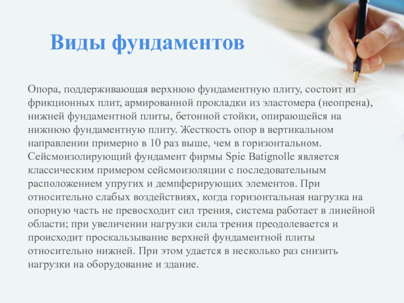 фундаментную плиту, состоит из фрикционных плит, армированной прокладки из эластомера (неопрена), нижней фундаментной плиты, бетонной стойки, опирающейся на нижнюю фундаментную плиту. Жесткость опор в вертикальном направлении примерно в 10 раз выше, чем в горизонтальном.