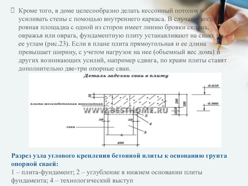 с помощью внутреннего каркаса. В случаях, когда ровная площадка с одной из сторон имеет линию бровки склона, овражья или оврага, фундаментную плиту устанавливают на сваях по ее углам (рис.23). Если в плане плита прямоугольная и ее длина превышает ширину, с учетом нагрузок на нее (объемный вес дома) и других возникающих усилий, например сдвига, по краям плиты ставят дополнительно две-три опорные сваи.